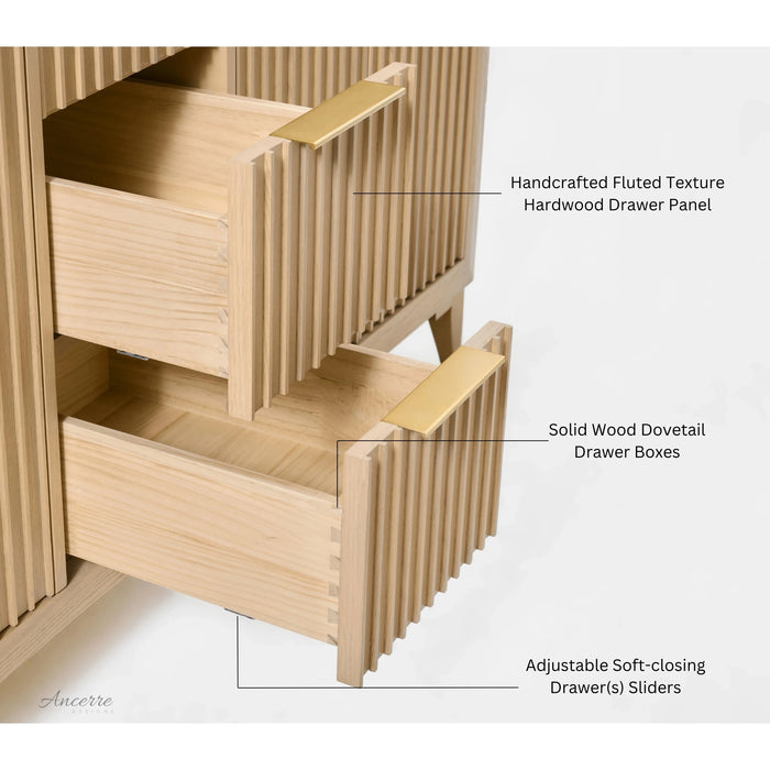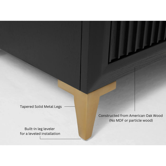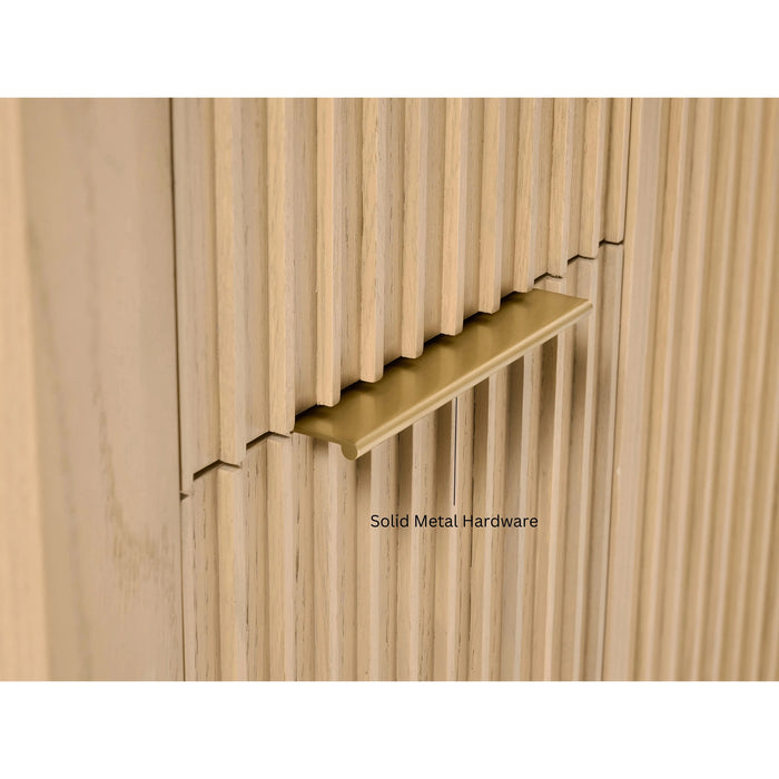 The Turlington Collection bath vanity effortlessly combines natural warmth with refined craftsmanship. Showcasing a stunning oak finish with vertical slat detailing, this vanity perfectly balances timeless elegance and modern functionality. The sleek White Quartz countertop contrasts beautifully with the warm wood tones, while gold-toned hardware adds a luxurious touch. Behind its stylish doors and drawers lies ample storage space for all your bathroom essentials.