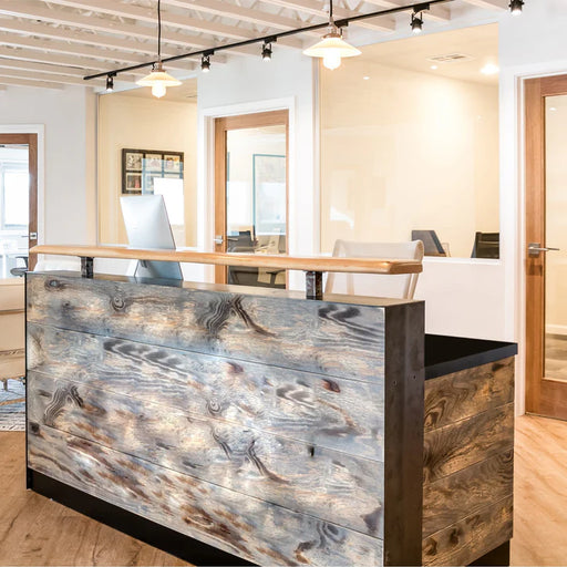 Reception Counter Solutions | 4–8 ft Memphis Modern Rustic Reception Desk Product Description Distressed wood and hot rolled steel reception des...