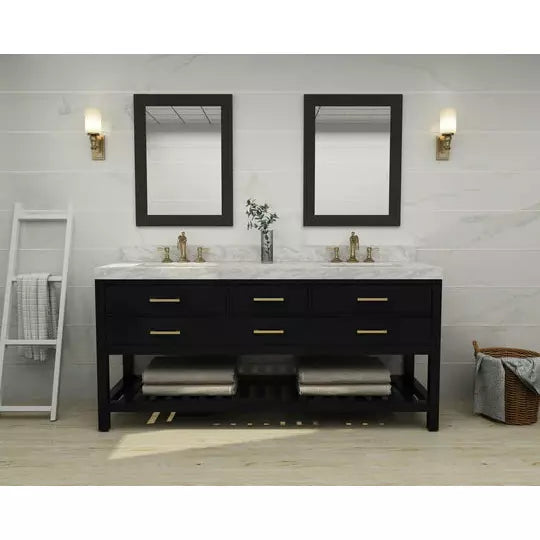 The Elizabeth Collection is a pure transitional design that brings balance & harmony to any space. From selecting quality wood to using the most durable soft-close hardware, no details were overlooked in crafting the Elizabeth 72 in. Vanity Set. The vanity set includes a furniture style cabinet, a thick imported Italian Carrara White marble top with a 4 in. backsplash, wide rectangular under mount basin, solid wood dovetailed drawer boxes, soft-close doors & drawers and gold finish hardware. Mirrors are sold separately (M-24-W).