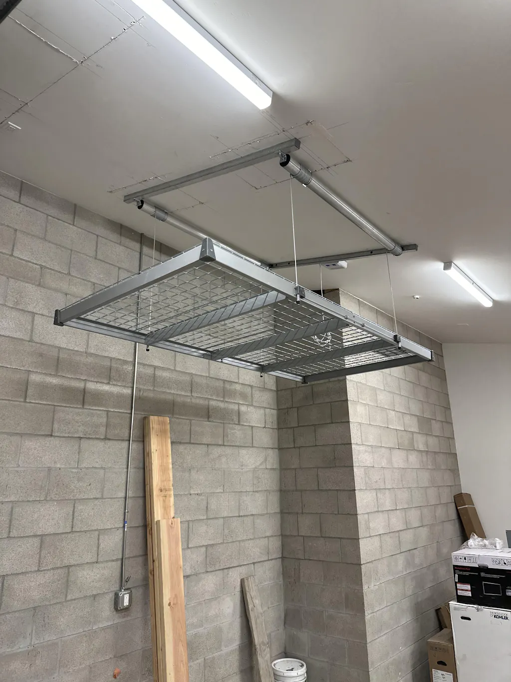 The Auxx-lift was designed to provide maximum storage, safety, convenience and a strikingly attractive design. We also eliminated the shortcomings of similar storage products such as low-quality components and safety issues. We use C-Channel beams and 1/4" wire mesh (on the platform).