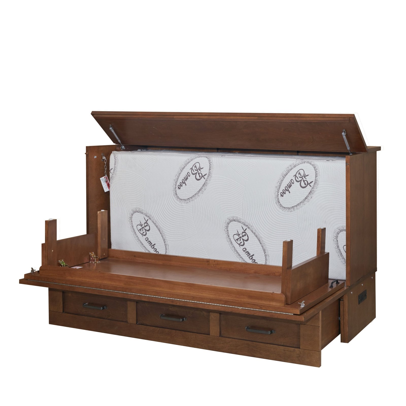 When closed, the cabinet bed measures 66.5"W x 25.25"D x 42.5"H, and it opens to a full 82" in length, providing a comfortable sleeping area for guests. The true queen-size tri-fold mattress, sized at 60"W x 80"L, features CertiPUR-US Gel Infused memory foam for exceptional comfort, along with a removable and washable bamboo cover. The spacious drawer (59"W x 18"D x 9"H) offers plenty of room for storing linens, blankets, and pillows. This versatile piece goes from a stylish furniture item to a fully functional bed in just 30 seconds, making it an ideal addition to any living space.