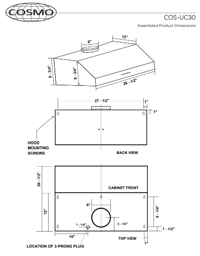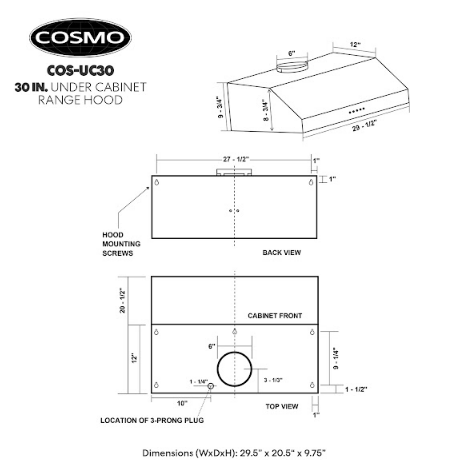 Made with professional styling, Cosmo’s COS-UC30 under cabinet range hood has a modern and minimalist design. 3 fan speeds, up to 380 CFM, is available at your fingertips for high-powered kitchen ventilation. Energy-efficient LEDs can be enabled with simple push-button controls. Clean up is a breeze with easily removable, permanent, dishwasher safe stainless steel filters. A 110V 3-prong power cord is included for easy installation. Cosmo appliances put professional quality in your home for factory-direct prices.