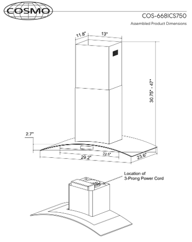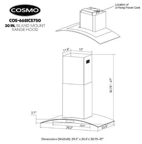 Cosmo presents a beautiful designer Italian style ductless Island Range Hood and it’s in a class of its own, with details like a reflective stainless steel body combined with a tempered glass visor. Coveted by kitchen design experts for its sophistication and ultra-modern aesthetic that seamlessly complement a variety of kitchen designs. Modern features, including commercial grade 430 stainless steel and 380 CFM centrifugal motor dedicated to ridding your house of lingering aromas. Premium stainless steel ARC FLOW permanent filters that are dishwasher-safe and extremely durable. No need to replace these filters, simply drop them in the dishwasher for easy maintenance. Our island range hood is both energy efficient and quiet. Utilizing high lumen LED lighting for year-round cost savings.