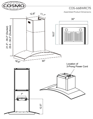 Cosmo’s COS-668WRC75-DL combines curved glass and stainless steel perfect for any modern kitchen. The flowing designs of our ductless 30″ wall mount range hood come with a 380 CFM centrifugal motor that traps smoke and fumes from lingering in your home. Cosmo Range Hoods include ARC-FLOW Permanent Filters are the only filters that provide greater airflow and are dishwasher safe for easy clean-up. Push-button controls manage multiple functions, including 3 fan speeds and LED lighting for added visibility. This ductless range hood includes a 3-prong power plug for easy use.