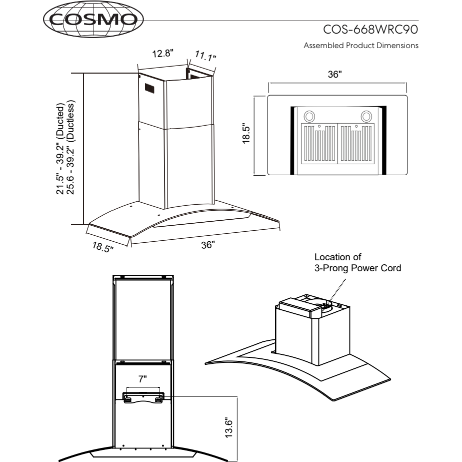 Cosmo’s COS-668WRC90-DL combines curved glass and stainless steel perfect for any modern kitchen. The flowing designs of our ductless 36 wall mount range hood come with a 380 CFM centrifugal motor that traps smoke and fumes from lingering in your home. Cosmo Range Hoods include ARC-FLOW Permanent Filters are the only filters that provide greater airflow and are dishwasher safe for easy clean-up. Push-button controls manage multiple functions, including 3 fan speeds and LED lighting for added visibility. This ductless range hood includes a 3-prong power plug for easy use.