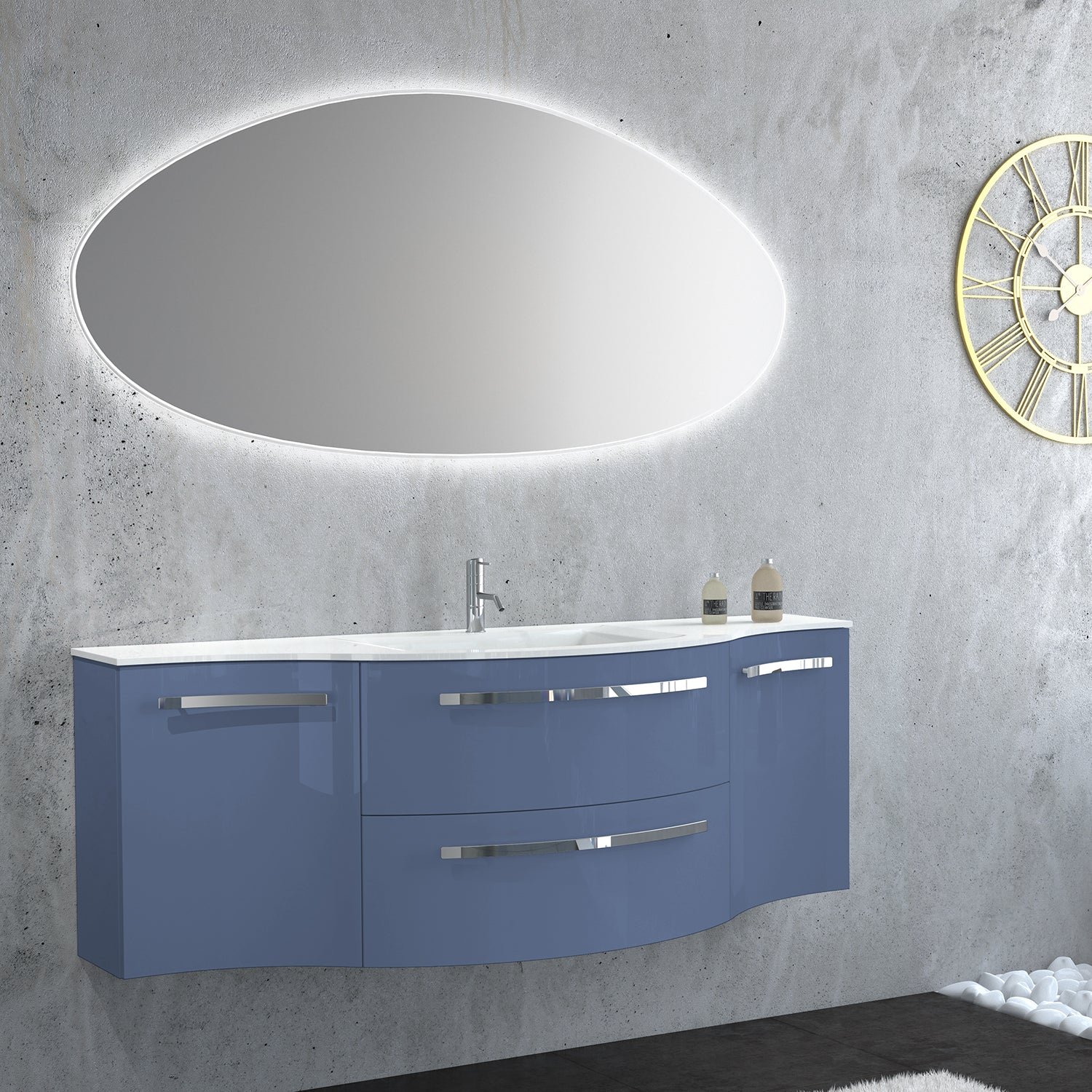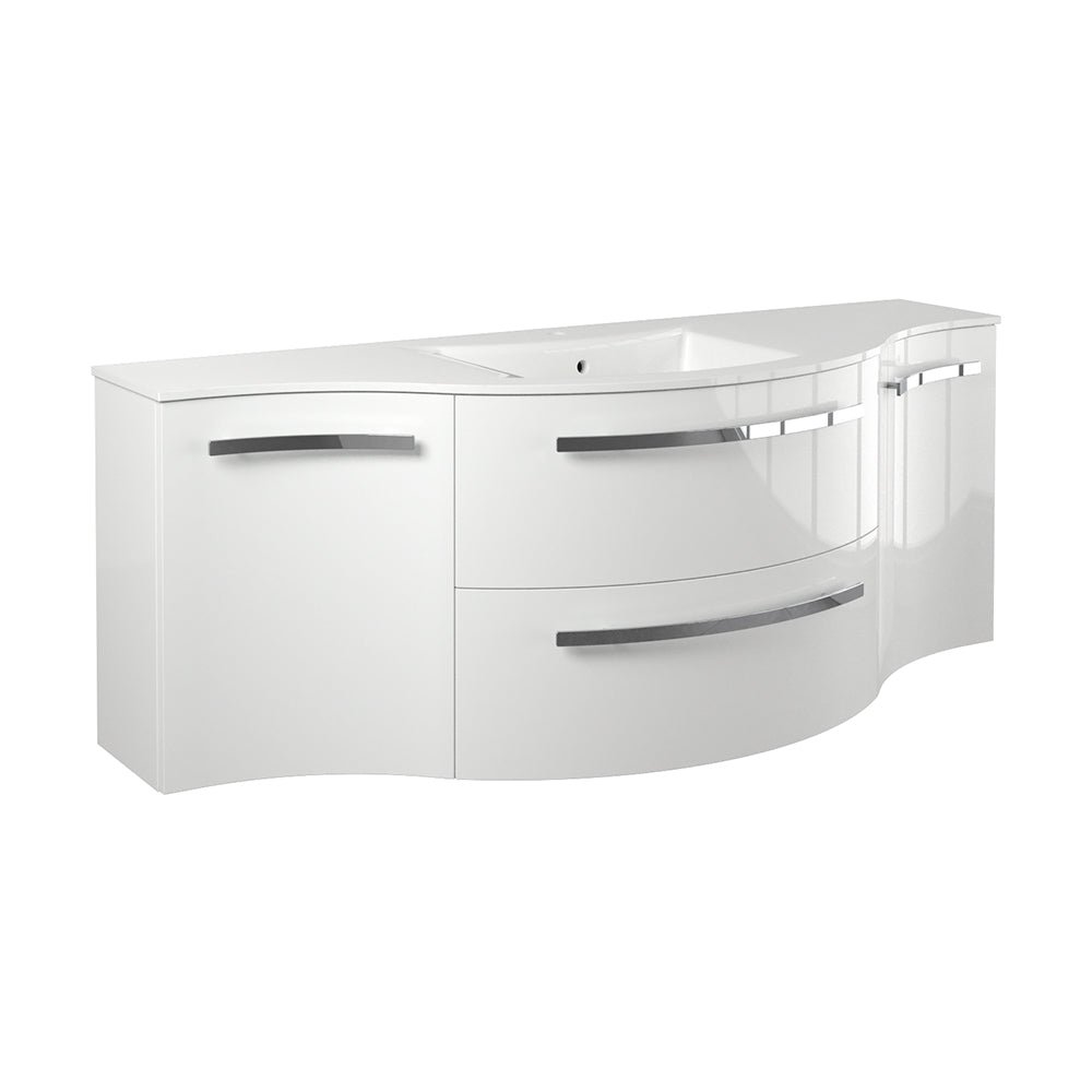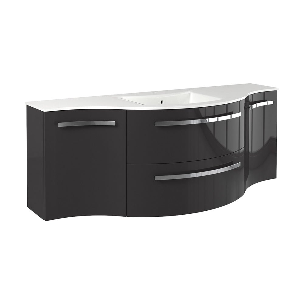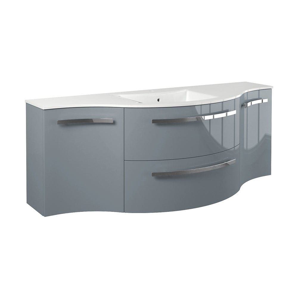 Ambra 57″ wall-mounted vanity in glossy black, white, BLUE DISTANTE, red, grey, slate or sand. This includes the vanity piece, which has two soft closing drawers, along with the Tekorlux (composite) sink top. Also, a left and right concave side cabinets, which have soft closing doors and one glass shelf each. Hardware is included. Optional legs are available (model number: CM068).