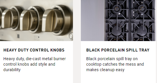 - Cooktop Features: Continuous Grates LP Convertible, Sealed Burners